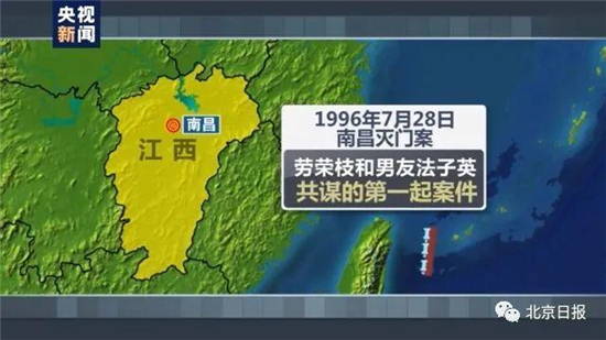1996年7月28日的南昌灭门案是劳荣枝和男友法子英共谋的第一起案件,公诉方出示的证据显示,二人的供述中都提到了“两人共同商定由劳荣枝去娱乐场所坐台物色绑架对象”,被害人熊某就是由劳荣枝在陪酒时物色到的。