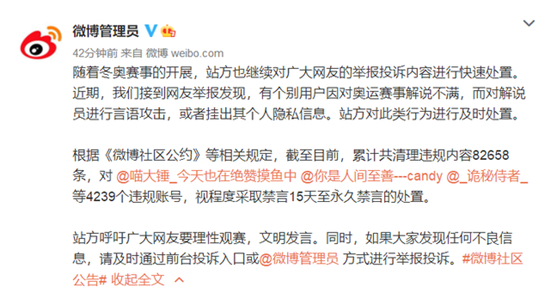 随着冬奥赛事的开展,站方也继续对广大网友的举报投诉内容进行快速处置。近期,我们接到网友举报发现,有个别用户因对奥运赛事解说不满,而对解说员进行言语攻击,或者挂出其个人隐私信息。站方对此类行为进行及时处置。