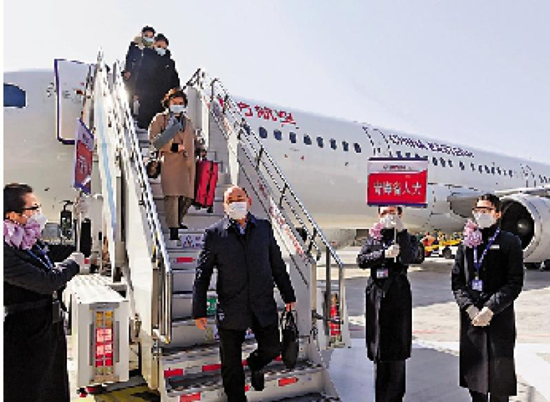 图:3月3日,出席十三届全国人大五次会议的青海代表团抵达北京。\青海日报