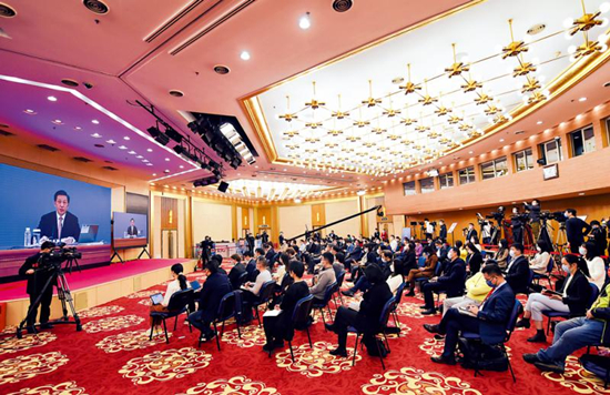 图:3月4日,十三届全国人大五次会议新闻发布会在北京人民大会堂新闻发布厅举行,由大会发言人张业遂就大会议程和人大工作相关问题回答中外记者提问。为有效防控疫情,共同维护公共卫生与健康,新闻发布会采用网络视频形式进行。