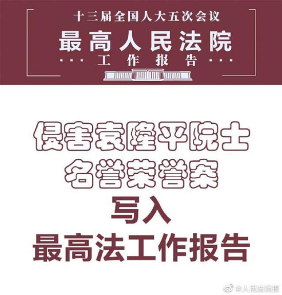 最高法工作报告:大力弘扬社会主义核心价值观。通过司法断案弘扬真善美、鞭笞假恶丑。审理侵害袁隆平院士名誉荣誉案,坚决维护共和国功勋的尊严。审理女童热心助人致伤案,判决善意助人不担责。审理小区保安送老人就医被索赔案,驳回无理赔偿请求。审理号贩子逃跑摔伤索赔案,判决追赶者无责。审理高铁霸铺案,判决曝光公共场所不文明行为无需担责。对长期霸占已售房屋、耍横抗拒执行的当事人采取强制搬迁措施,决不让“赖而不决”大行其道。通过一系列司法判决,鼓励崇尚英模、邻里相助、助人为乐、志愿服务、舆论监督,决不向耍横霸道者让步,决不迁就纵容恶习陋俗,让广大群众知道法治社会提倡什么、反对什么、禁止什么。