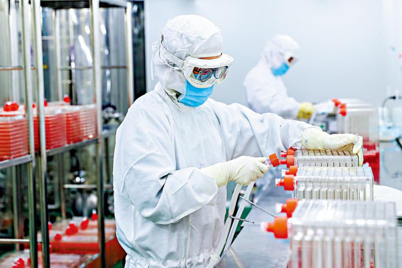 图:科兴中维的工作人员利用细胞工厂进行Vero细胞培养研发新冠疫苗。\新华社