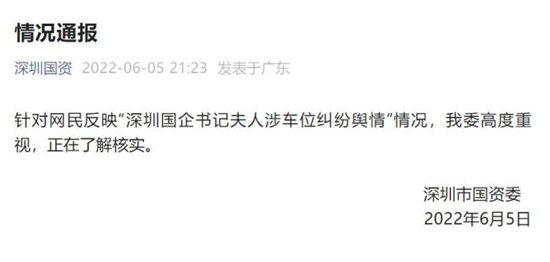 5日,深圳市国资委官微发布情况通报称,针对网民反映“深圳国企书记夫人涉车位纠纷舆情”情况,我委高度重视,正在了解核实。
