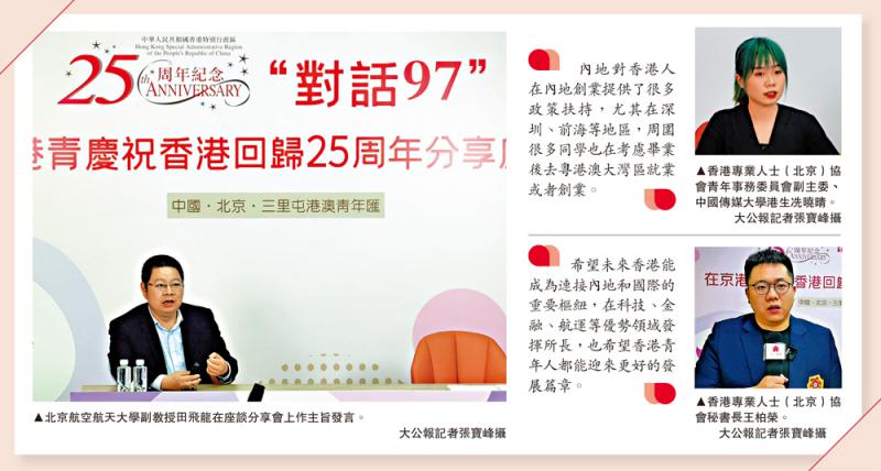 为庆祝香港回归祖国25周年,12日,由香港专业人士(北京)协会、北京市朝阳区青年联合会共同主办的“‘对话97’在京港青庆祝香港回归25周年座谈分享会”,在北京三里屯港澳青年汇举行。活动通过“线上+线下”的方式,邀请多位嘉宾分别从不同角度分享了自己对香港回归25年来的观察与感悟,与会港青与嘉宾共话内地发展机遇。有港青表示,到内地升学的香港人越来越多,而内地对港人提供的就业扶助政策持续优化,不少应届毕业生将大湾区视作就业创业首选地。