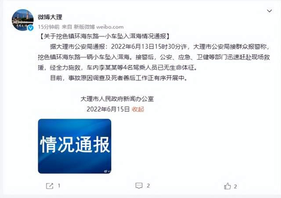 据大理市公安局通报:2022年6月13日15时30分许,大理市公安局接群众报警称,挖色镇环海东路一辆小车坠入洱海。接警后,公安、应急、卫健等部门迅速赶赴现场救援,经全力施救,车内李某某等4名驾乘人员已无生命体征。