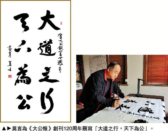 图:莫言为《大公报》创刊120周年题写“大道之行,天下为公”。