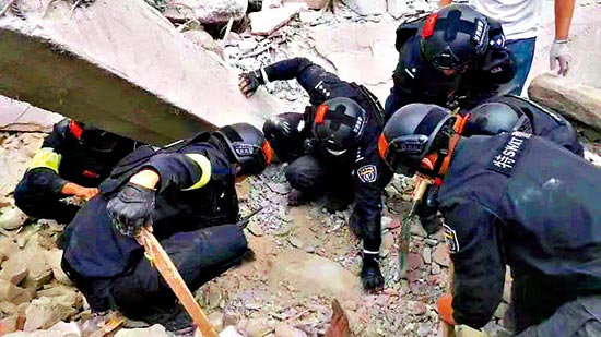 图:甘孜特警突击救援小组徒手刨土解救被困群众。