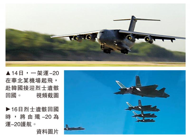 图:(上)14日,一架运-20在华北某机场起飞,赴韩国接迎烈士遗骸回国。\视频截图;(下)16日烈士遗骸回国时,将由歼-20为运-20护航。\资料图片