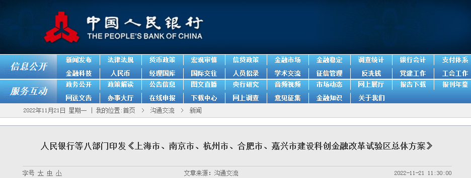 据中国人民银行网站11月21日消息,人民银行等八部门印发《上海市、南京市、杭州市、合肥市、嘉兴市建设科创金融改革试验区总体方案》: