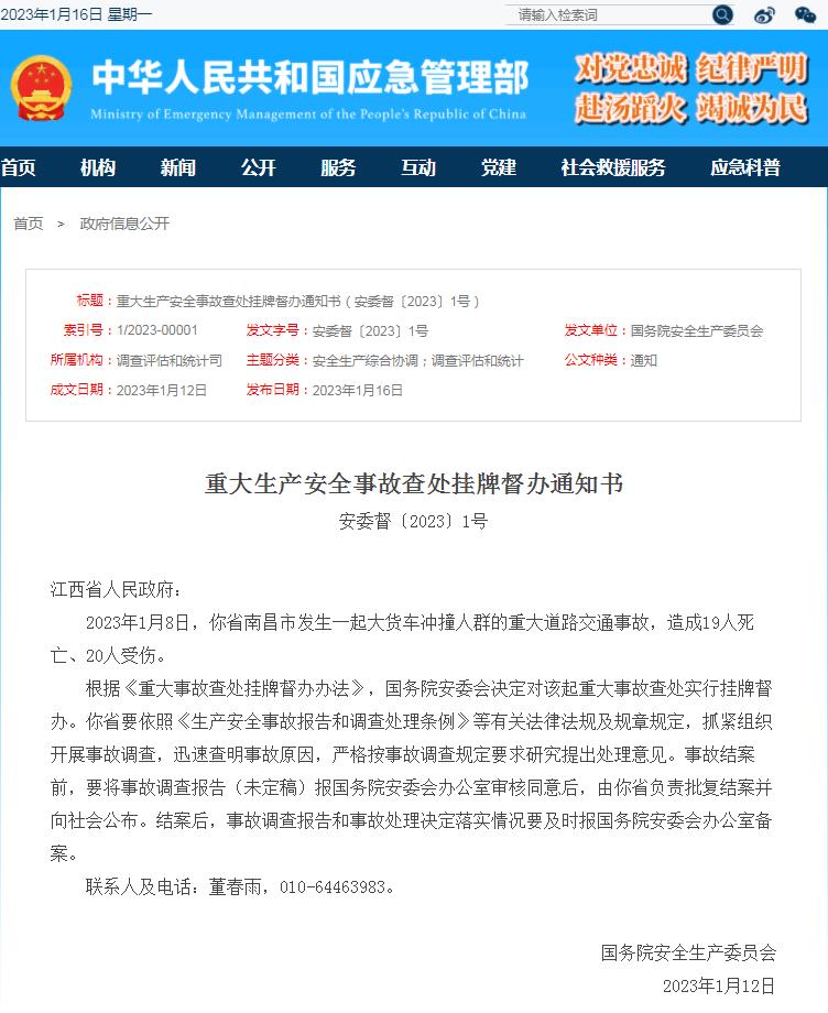 据应急管理部官网消息,日前,国务院安全生产委员会向江西省人民政府发出《重大生产安全事故查处挂牌督办通知书》。通知书指出,2023年1月8日,江西省南昌市发生一起大货车冲撞人群的重大道路交通事故,造成19人死亡、20人受伤。根据《重大事故查处挂牌督办办法》,国务院安委会决定对该起重大事故查处实行挂牌督办。
