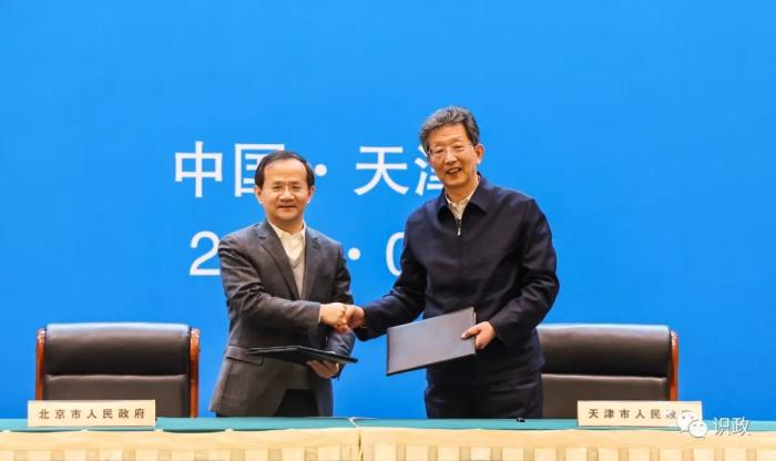 北京市市长殷勇、天津市市长张工代表双方共同签署《北京市人民政府 天津市人民政府进一步加强战略合作框架协议》。 图片来源:北京日报·识政