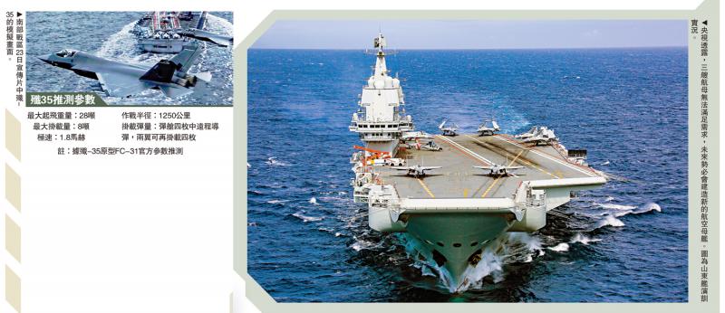 左图:南部战区23日宣传片中歼-35的模拟画面。右图:央视透露,三艘航母无法满足需求,未来势必会建造新的航空母舰。图为山东舰演训实况。