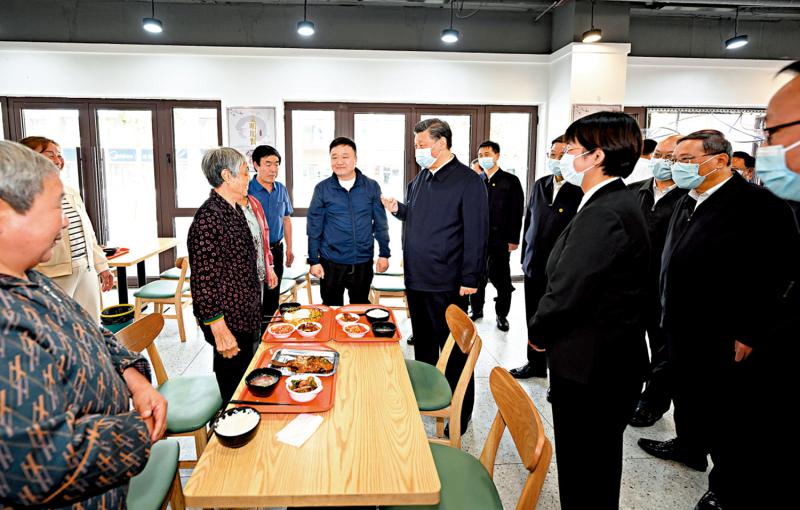 图:10日上午,习近平在容东片区南文营社区食堂同就餐的社区老人亲切交流。\新华社
