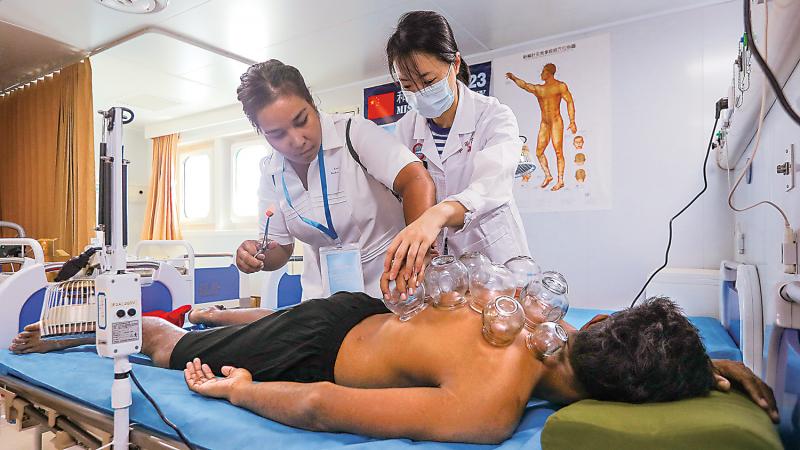 图:7月17日,中国海军“和平方舟”号医院船中医大夫指导一名基里巴斯护士学习拔罐。\新华社