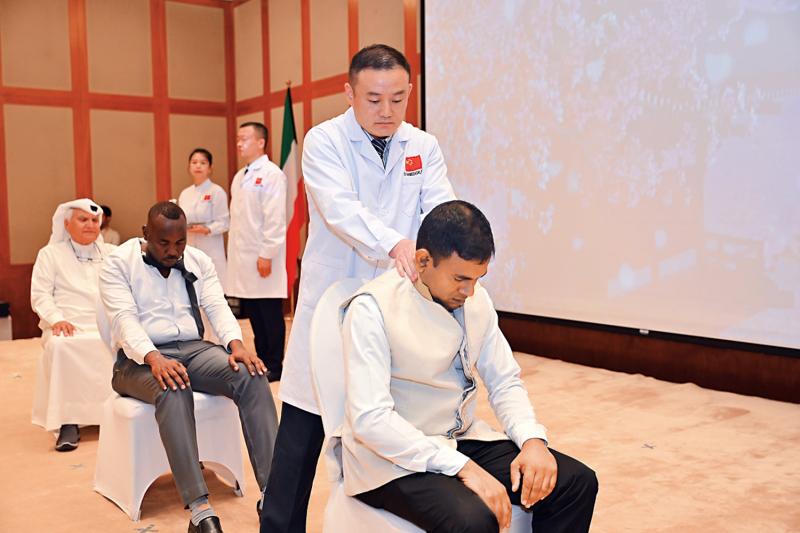 图:9月11日,中国第15批援科威特医疗队队员在科威特展示按摩推拿。\新华社