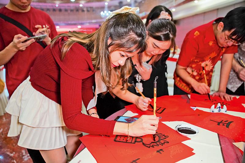 图:广西民族大学留学生们照着图例写福字和春联。\中新社