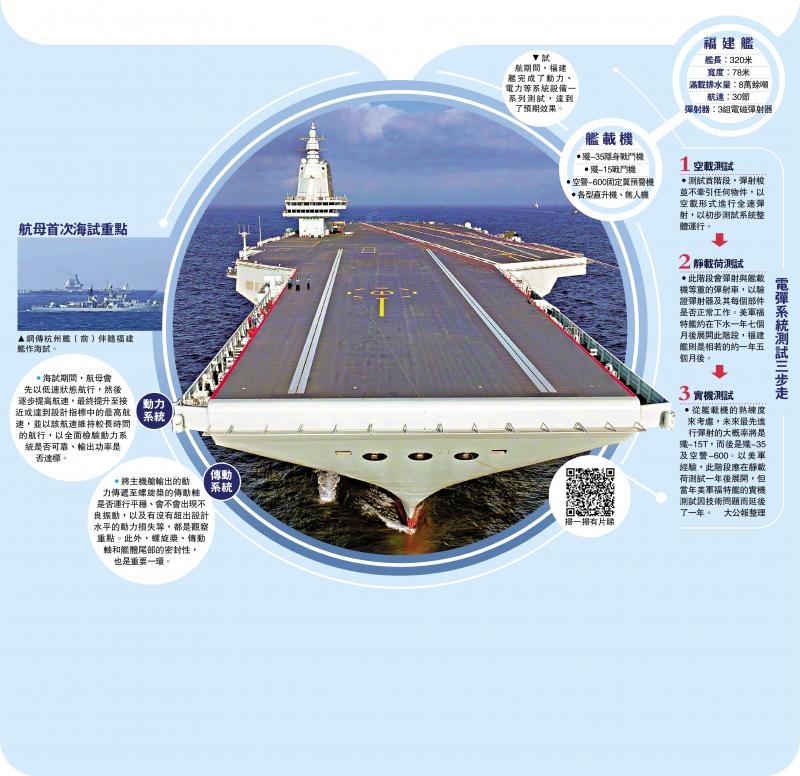 资料显示,福建舰采用平直通长飞行甲板,配置电磁弹射和阻拦装置,满载排水量8万馀吨。央视报道称,从辽宁舰到山东舰,再到福建舰,人民海军航母建设实现了从无到有、从改装到国产、从滑跃到弹射的升级跨越,创造了令人瞩目的“中国速度”。