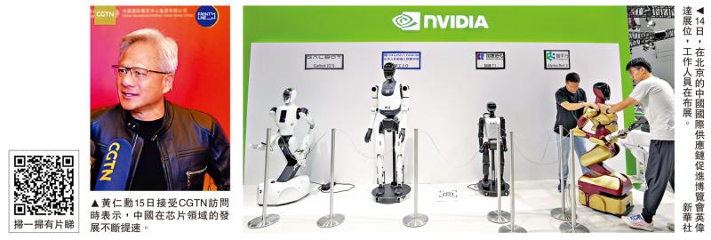 左图:黄仁勳15日接受CGTN访问时表示,中国在芯片领域的发展不断提速。右图:14日,在北京的中国国际供应链促进博览会英伟达展位,工作人员在布展。\新华社