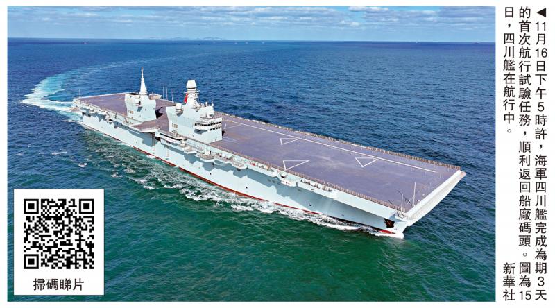 图:11月16日下午5时许,海军四川舰完成为期3天的首次航行试验任务,顺利返回船厂码头。图为15日,四川舰在航行中。\新华社