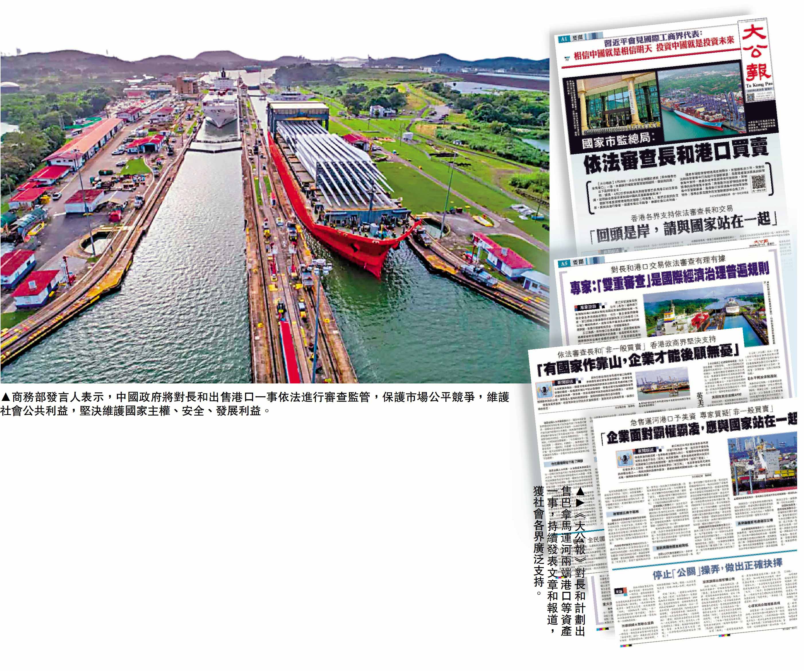 3月18日起,《大公报》再陆续刊登多篇新闻综述文章,指出“这是一桩战术精明、战略失明的买卖”、“营商不顾国家利益,终究会自毁基石”、“企业面对霸权霸凌,应与国家站在一起”等综述。香港各界人士纷纷指出,向美国霸凌“跪低”,只会让霸权主义变本加厉。只有强大的祖国,才能保障企业得到公平的贸易环境与发展空间。他们纷纷呼吁,长和应该从一个更宏观的角度理解有关交易背后的政治问题,站在历史正确的一边。
