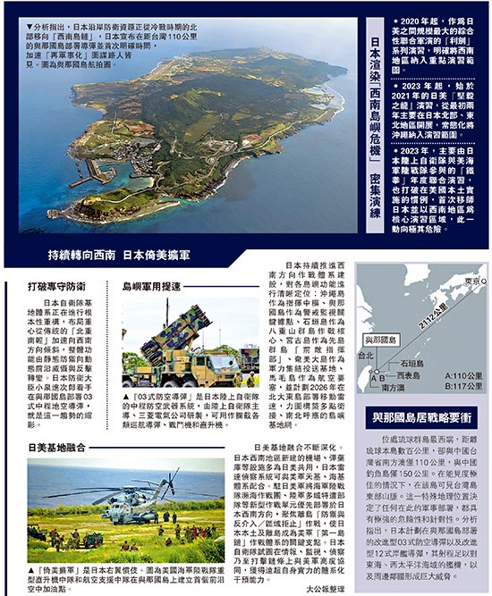 近年来,日本一直在加速强化自卫队在琉球群岛地区的部署。2016年,日本陆上自卫队在与那国岛设立驻屯地,部署约160人的沿岸监视部队。2019年,在奄美大岛和宫古岛分别建设基地,并部署地对空、岸舰导弹部队。2023年,自卫队在石垣岛开设驻屯地,配置了12式岸舰导弹、中程03式中程防空导弹,并组建八重山警备队,总驻扎约570人。