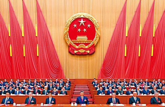 图:3月12日下午,第十四届全国人民代表大会第四次会议在北京人民大会堂闭幕。党和国家领导人习近平、李强、王沪宁、蔡奇、丁薛祥、李希、韩正等在主席台就座。\新华社