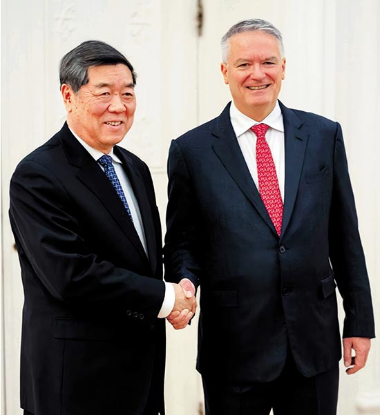 图:中美第六轮经贸磋商昨日在法国巴黎举行,地点为经济合作与发展组织(OECD)总部。中国国务院副总理何立峰与前来迎接的经合组织秘书长马蒂亚斯·科尔曼合影。