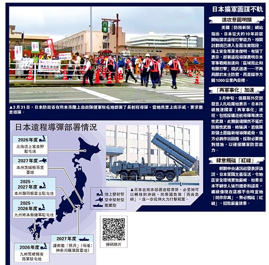 加强西太军事部署,日本图谋勾连美国。英国广播公司援引日本自卫队退役将领分析称,日本在熊本部署远程导弹,必要时可以转移到冲绳、与那国岛等“西南岛屿”,进一步延伸火力打击范围。日本军事重心逐步向西南方向转移,能威胁从中国东海到菲律宾海北部的目标;在美日军事同盟体系内,它们也可以为美军提供掩护。在九州部署的“25式地对舰导弹”,射程约1000公里,覆盖台岛以至中国大陆沿海部分地区。