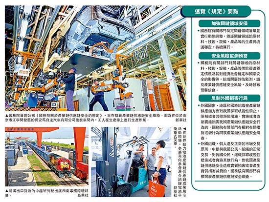 此次公布的《国务院关于产业链供应链安全的规定》第十四条、第十五条对于损害中国产业链供应链安全的行为作出了规定。中国人民大学重阳金融研究院副院长、研究员蔡彤娟表示,《规定》不仅为中国应对“实体清单”、技术断供等不公平制裁提供了有力法律武器,更通过制度化方式将反制能力转化为可预期的规则威慑,彰显了中国在复杂国际环境下扞卫发展权益、完善全球经济治理的制度性话语权。