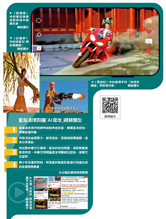甄嬛枪战、宝黛对拳、孙悟空与关羽结拜……近期,AI“魔改”经典影视剧成为热潮。随着人工智能技术的不断演进,这些由AI处理的短视频不仅画面更加逼真流畅,而且其制作门槛也大幅降低。在流量和利益的驱动下,“AI魔改”已形成一条完整的灰色产业链,低成本即可购买AI视频制作教程。