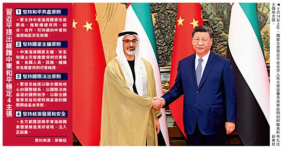习近平就维护和促进中东和平稳定提出4点主张:一是坚持和平共处原则。中东海湾国家唇齿相依,是搬不走的邻居。要支持中东海湾国家改善关系,推动构建共同、综合、合作、可持续的中东和海湾地区安全架构,筑牢和平共处的根基。二是坚持国家主权原则。主权是各国特别是广大发展中国家安身立命的依托,不容侵犯。中东海湾国家主权、安全和领土完整应当得到切实尊重,各国人员、设施、机构安全应当得到切实维护。三是坚持国际法治原则。维护国际法治权威,不能“合则用、不合则弃”,不能让世界倒回丛林法则。要坚定维护以联合国为核心的国际体系、以国际法为基础的国际秩序、以联合国宪章宗旨和原则为基础的国际关系基本准则。四是坚持统筹发展和安全。安全是发展的前提,发展是安全的保障。各方都应该为中东海湾国家发展营造良好环境、注入正能量。中方愿同中东海湾国家分享中国式现代化机遇,厚植地区发展和安全土壤。
