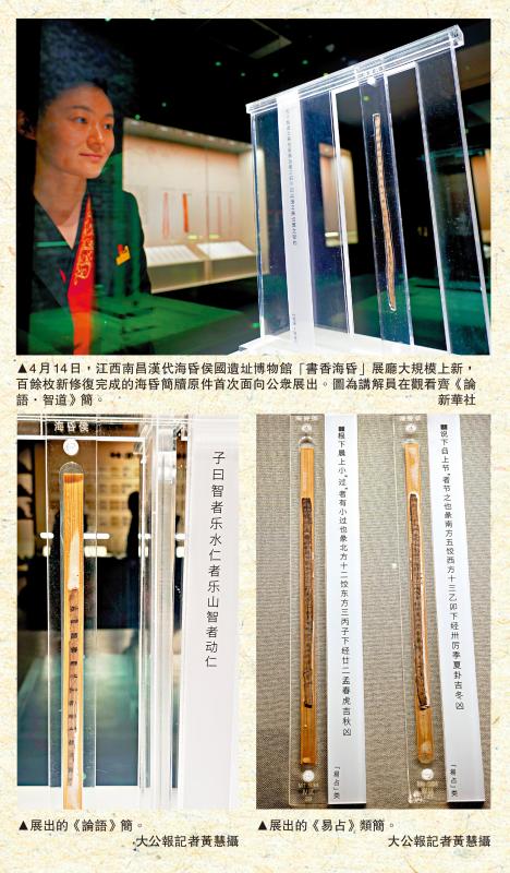 为解决墨色褪色致使竹简内容难以辨识的难题,南昌汉代海昏侯国遗址博物馆特意在每枚简牍一侧,标注出简牍内容对应的简体大字。展陈中最受瞩目的是已失传1800余年的齐《论语.智道》竹简和秦汉时期全本《诗经》竹简。以上儒家经典及孔子衣镜随葬,加上刘贺担任昌邑王期间,属官郎中令龚遂、王师王式、中尉王吉等人皆为当世名儒,充分彰显了刘贺对儒家思想的尊崇。\大公报记者 黄慧南昌报道