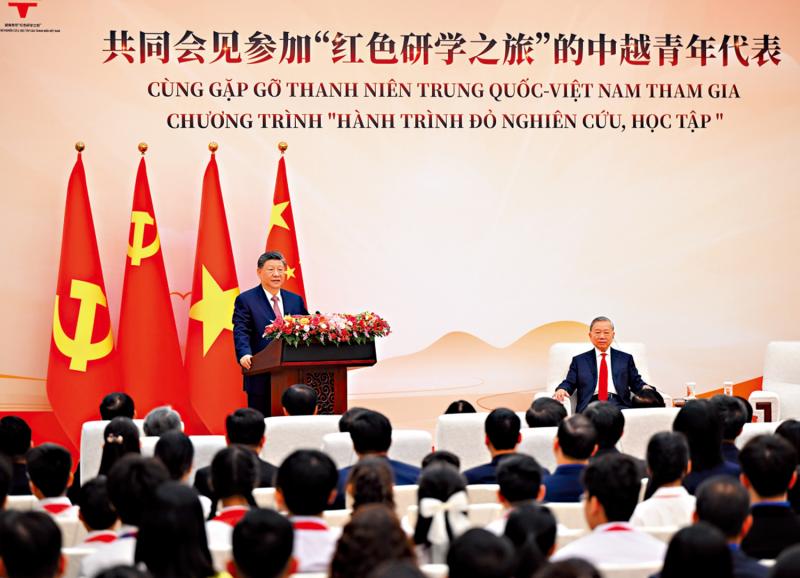 习近平表示,去年我和苏林总书记一道启动“红色研学之旅”项目,一年来,两国青年共同探寻中越友好的红色基因,感受中国式现代化的万千气象,在中国各地留下许多互学互鉴、相知相亲的生动故事。中越友好的未来在青年,我相信中越青年一定能够勇做两国世代友好的传承者和接班人,我们共同的事业一定能够不断地兴旺发达。