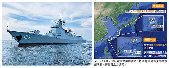 4月19日,133号舰艇编队过航横当水道赴西太开展演训活动。4月22日,133编队完成西太海域演训活动,经与西水道返回。与西水道位于与那国岛与西表岛之间,其中,与那国岛距离我国钓鱼岛只有170公里的距离。