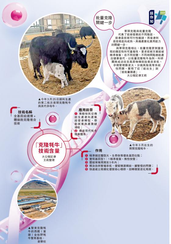 与单头克隆相比,批量克隆更侧重流程的稳定性和可重复性,要求技术方案能被精准覆製,在不同受体、不同时间点都能产出健康后代。以批量克隆牦牛为例,科研团队成功攻克高原物种胚胎着床率低、孕期管理难度大、分娩风险高等系统性问题,实现了从“能出生”到“能批量顺产”。\大公报记者王莉