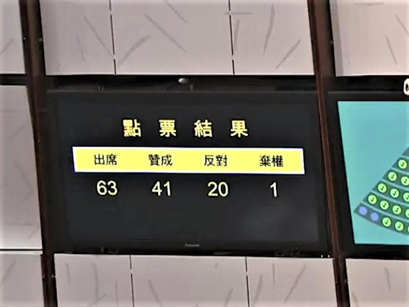 草案二读以41票赞成、20票反对、1票弃权下通过(电视截图)