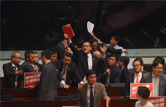 图:乱港派“做骚”大闹议会,林卓廷、尹兆坚、许智峯、区诺轩相继被逐,“一地两检”草案二读在混乱中通过中通社