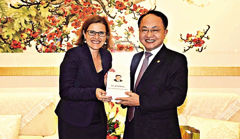 会谈结束后,王志民向彭朗宁一行赠送了《习近平谈治国理政》英文版、《宪法》《基本法》合订本等书籍。