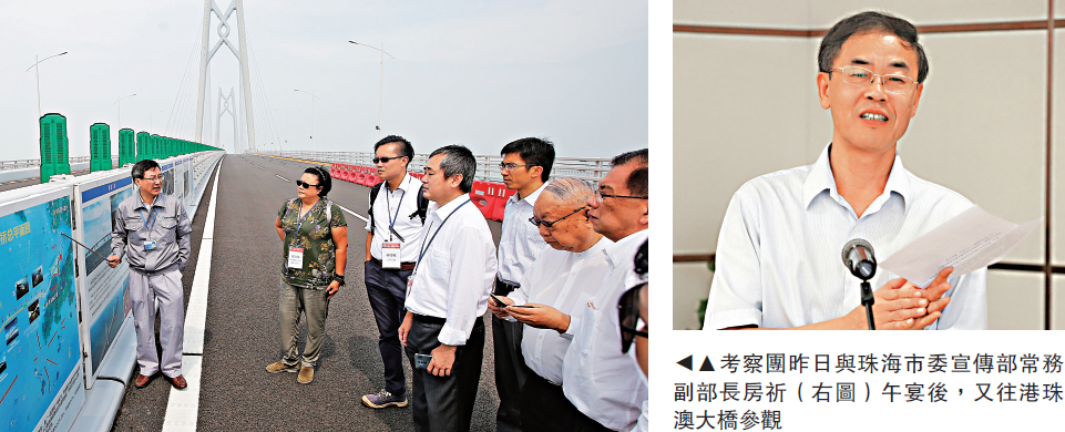 图:考察团昨日与珠海市委宣传部常务副部长房祈(右图)午宴后,又往港珠澳大桥参观