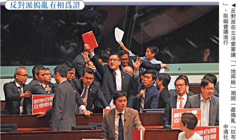 图:反对派在立法会审议“一地两检”期间一直捣乱“拉布”,阻碍会议进行/中通社