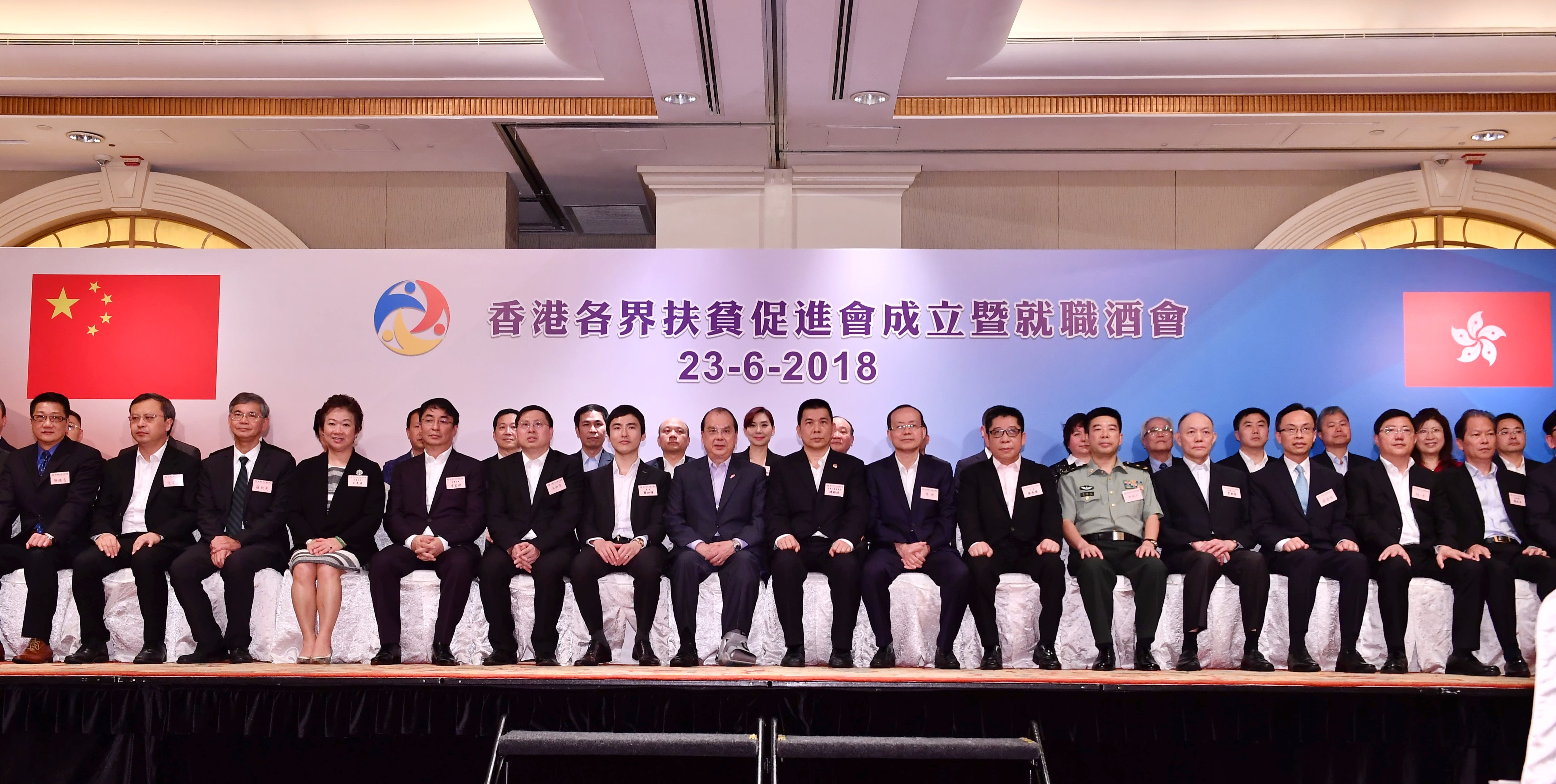 香港中联办副主任杨健(前排左十)、政务司司长张建宗(前排左八)、香港各界扶贫促进会召集人及监事长谭锦球(前排左九)、香港各界扶贫促进会会长蔡加讚(前排左七)、劳工及福利局局长罗致光(前排左三)、政制及内地事务局局长聂德权(前排右三)及其他嘉宾在典礼上合照