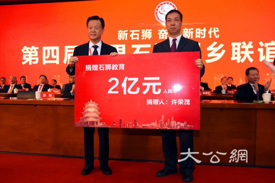 全国政协常委、世茂集团董事局主席许荣茂(左)向石狮教育事业捐赠2亿。(蒋煌基 摄)