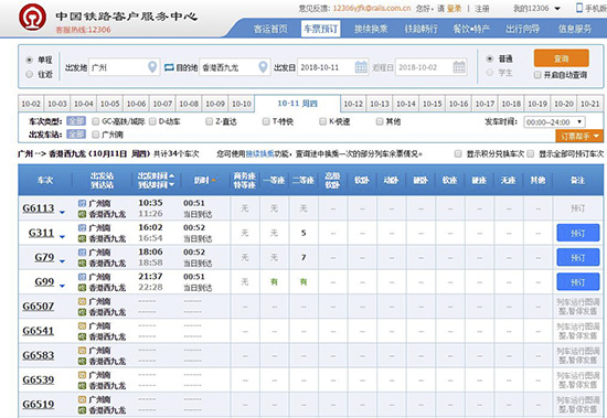 记者登录12306购票网站,证实了旅客反映的问题。查阅发现,11日,从广州南站发往香港的34趟车次中,始发车全部停售,只有分别从长沙南、昆明南、北京西、上海虹桥站经停广州南站的4趟车车票可售。对于停售原因,铁路部门尚未发布官方消息,而12306网站在停售列车车次后面备注“列车运行图调整,暂停发售”。