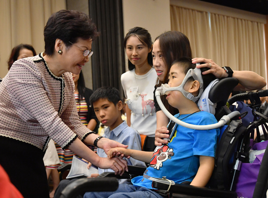 香港特区政府今日公布“以人为本”措施最新进展。图为林郑看望脊髓肌肉萎缩症病人