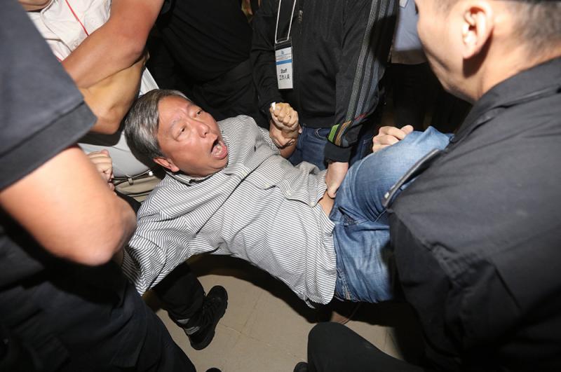 图:李卓人前日出席补选简介会时大肆闹事,被职员抬离场