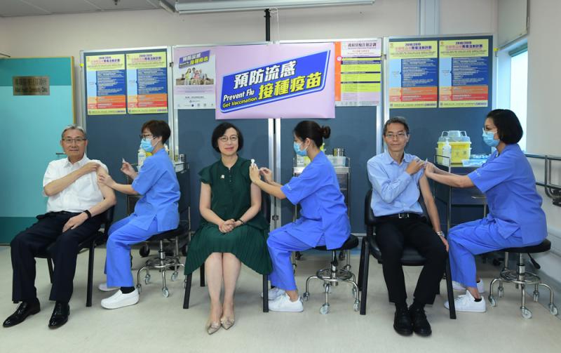 图:食卫局局长陈肇始昨日到访西湾河普通科门诊诊所,了解政府防疫注射计劃展开首日的推行情况。图示陈肇始(左三)、署理卫生署署长黄加庆(右二)和医管局主席梁智仁(左一)接种季节性流感疫苗