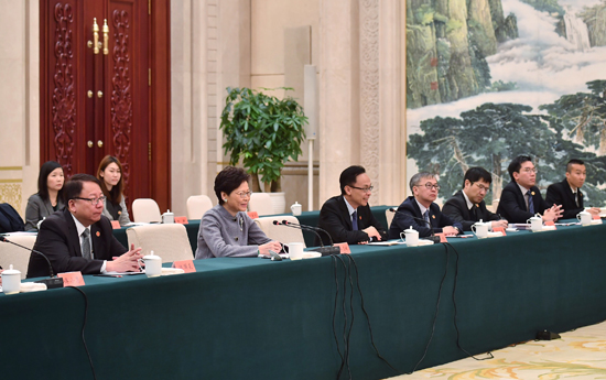 林郑月娥(左二)在河北与河北省委书记王东峰和河北省省长许勤会面。政制及内地事务局局长聂德权(左三)和行政长官办公室主任陈国基(左一)亦有出席