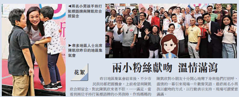 家住红磡的蒋先生昨日特地前去为陈凯欣加油,认真研读过陈凯欣政纲的他认为,对方密切关注香港基层市民的住屋、医疗等问题,真心诚意为街坊做实事。市民关女士亦表示,经常在街头见到陈凯欣与街坊邻里交谈,发觉她有亲和力之余,亦会认真记下诉求,相信她在议会能为市民排忧解难。