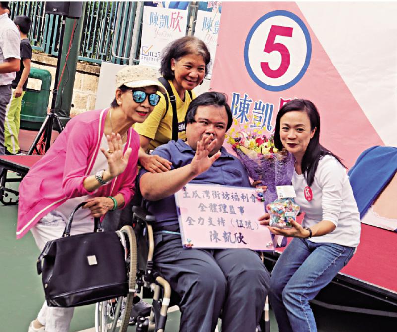 陈凯欣做记者出身,长期站在社会最前线,其后转职政府,又在攸关民生的食物及卫生领域服务,再后来仍心系大众福祉,在社企继续贡献社会。昨日的地区集气会上,本身是伤残人士的土瓜湾街坊福利会副理事长黄俊健,坐着轮椅到场支持陈凯欣。