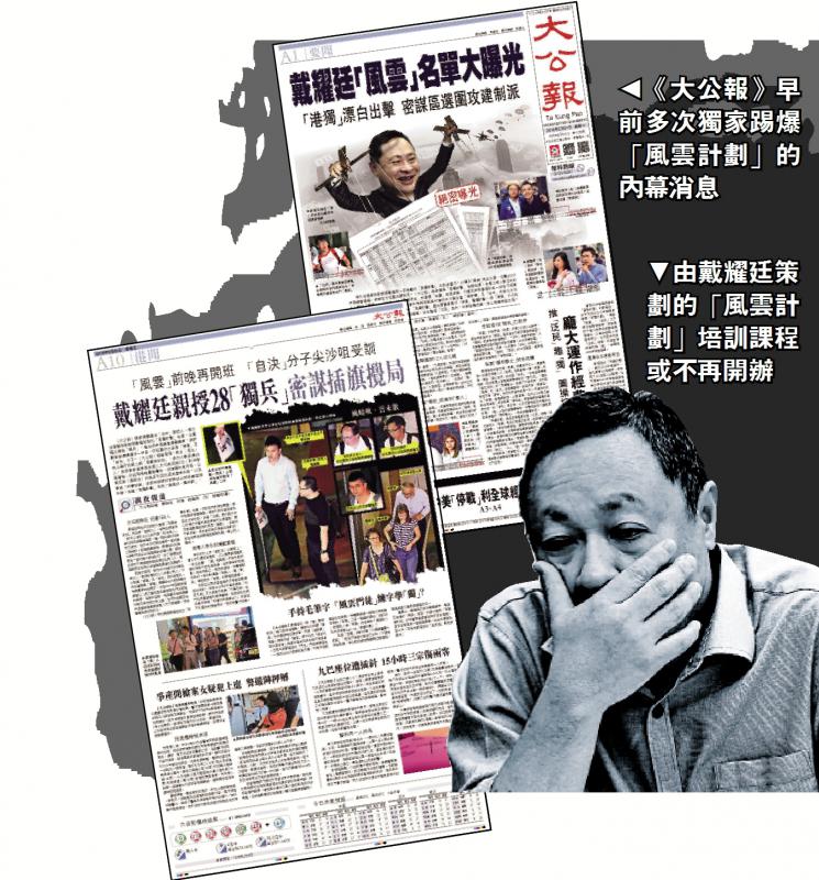 《大公报》早前多次独家踢爆戴耀廷“风云计划”的内幕消息,包括渗透地区的“风云战士”名单、传统“泛民”与激进“伞兵”,因“分赃不匀”爆发内讧等。“风云计划”导师张荣辉昨接受传媒访问时称,“风云计划”或不再开办培训课程,显见有关行动不得人心。
